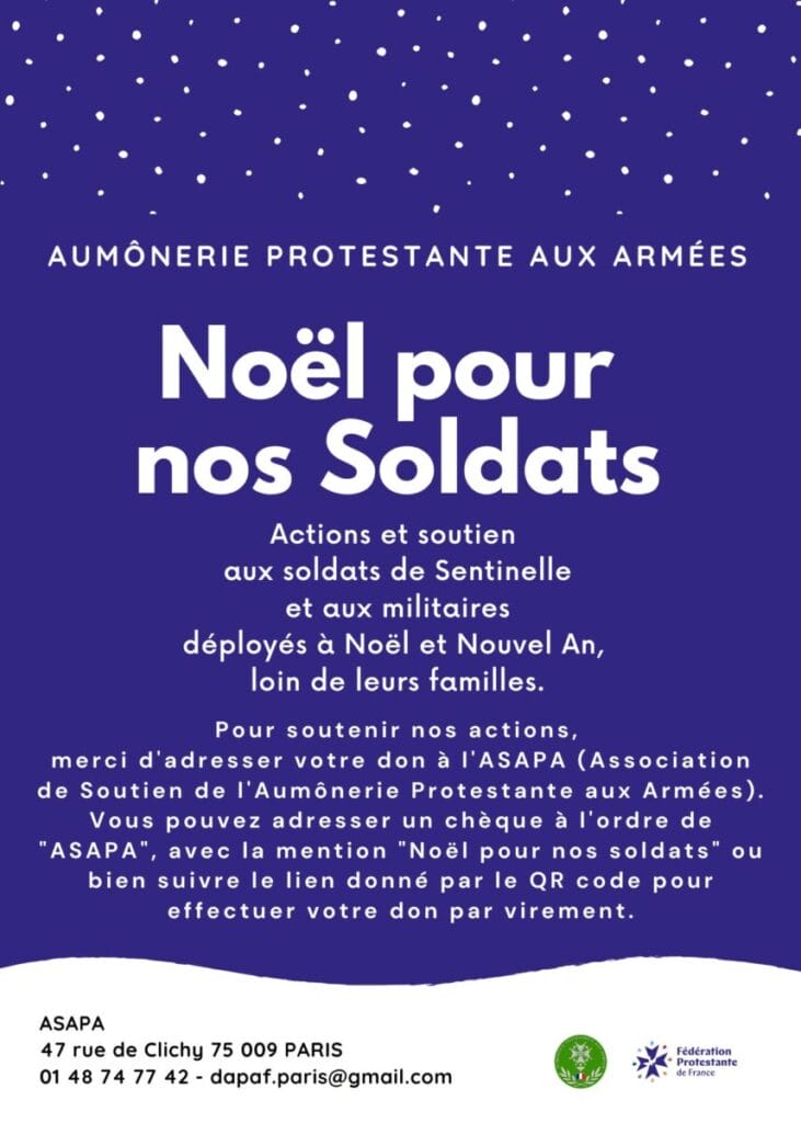 Cette année encore, l’Aumônerie Protestante aux Armées vous propose de soutenir concrètement les soldats de l’opération SENTINELLE et les militaires déployés à Noël et Nouvel An, et qui passent les fêtes de fin d’année loin de leur famille, à travers son opération « Noël pour nos Soldats ». Si vous aussi vous avez à coeur de les […]