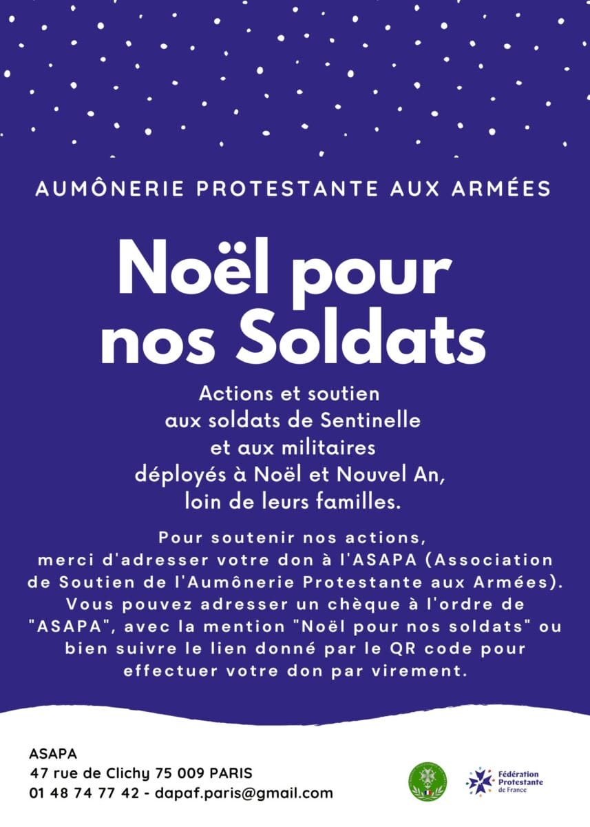 Cette année encore, l’Aumônerie Protestante aux Armées vous propose de soutenir concrètement les soldats de l’opération SENTINELLE et les militaires déployés à Noël et Nouvel ...